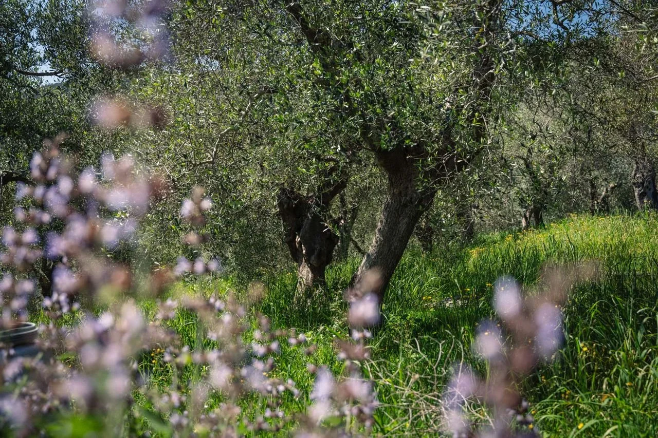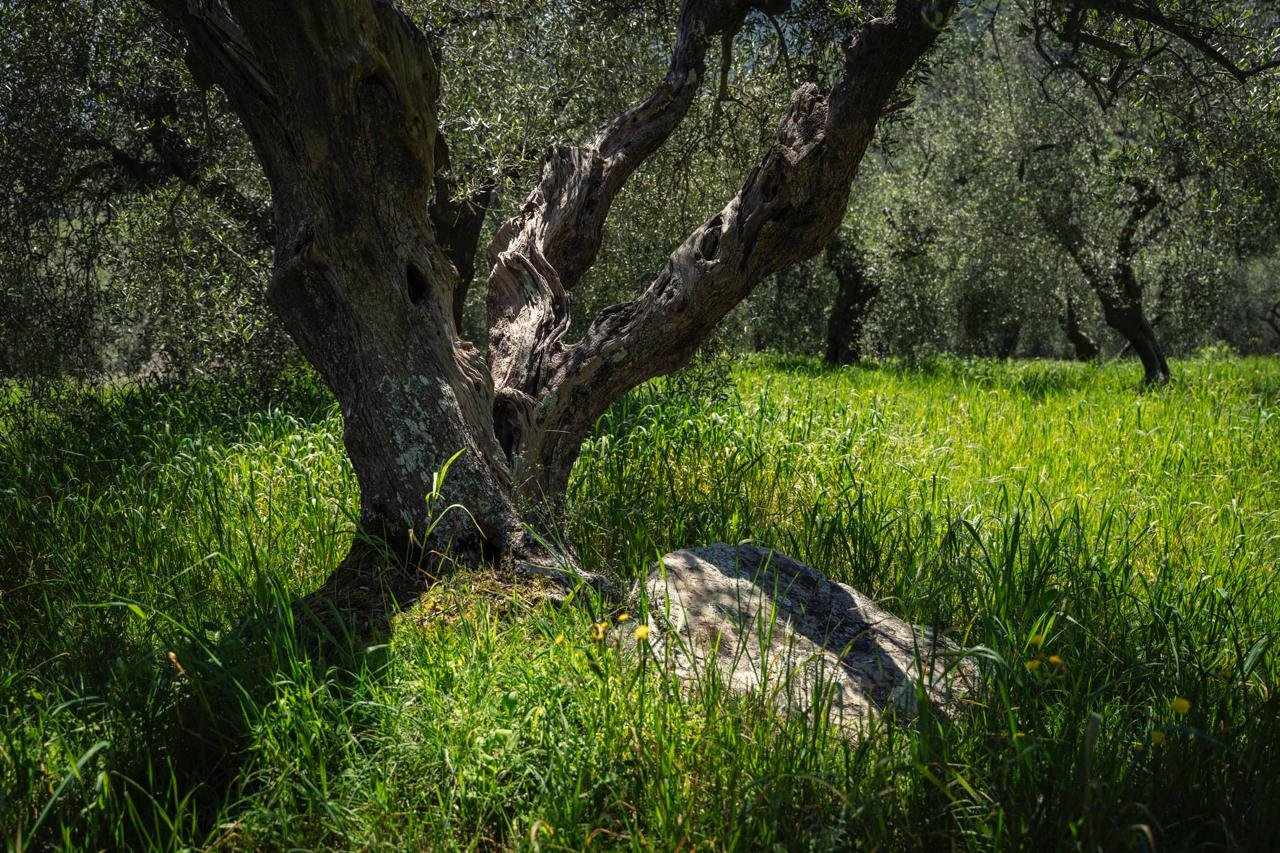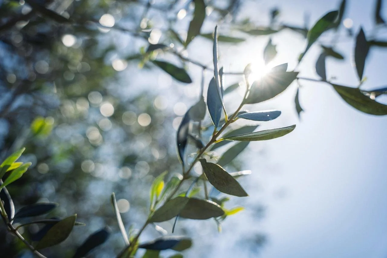 The olive tree’s leaves are narrow and firm, growing in pairs directly across from one another. dark green on top and silvery underneath, giving the whole tree a soft, grey‑green look. The bark becomes rough and deeply lined as the tree ages, adding to its characteristic, ancient appearance. In our grove, many of the trees are ‘newer’ cultivars that have been grafted onto 400 year old trunks.