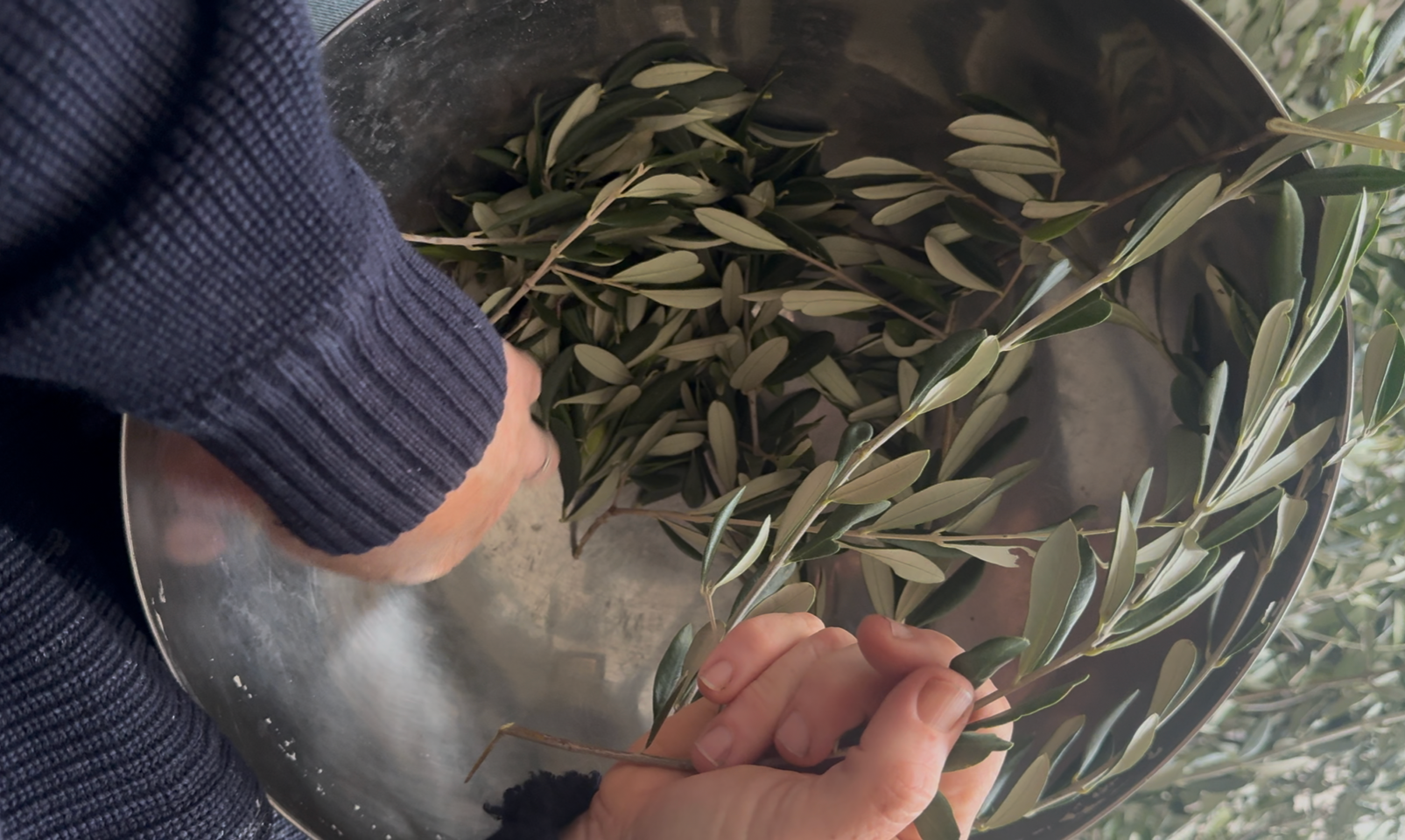 I asked Johanna, who cares for our old grove, if the next time she pruned she would bring me some. Johanna is old school - she has names for each of the trees and has the kind of reciprocal relationship with them that I am hoping to engender in my dye journey. Johanna tends to these trees to bring out their very best and they respond by offering her a deliciously spicy oil, rich in health-giving properties.